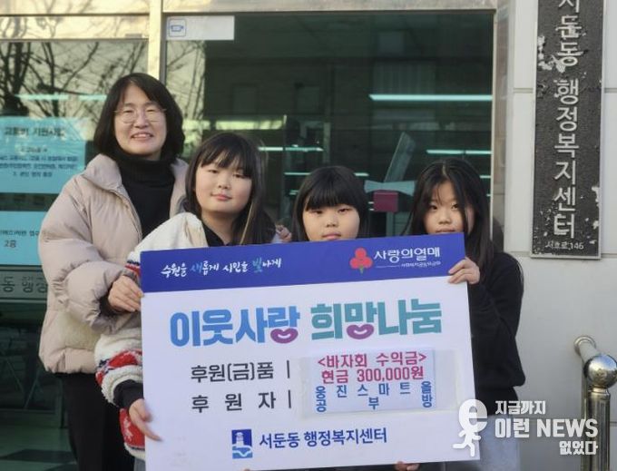전달된 기부금은 지난 24일 공부방 ‘서둔 웅진스마트올클래스’와 사회적 협동조합 ‘더불어숲공교육’공동 주최한 어린이 플리마켓에서 마련됐다.