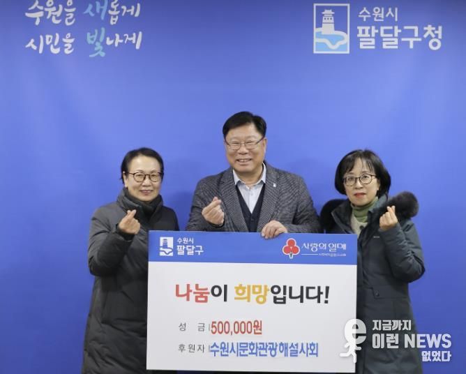 이상균 팔달구청장은 “해마다 변함없이 팔달구를 위해 따뜻한 나눔을 실천해주시는 수원문화관광해설사회에 깊이 감사드린다”며 “기탁해주신 성금은 꼭 필요한 이웃들에게 소중히 전달하겠다”고 밝혔다.