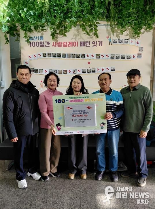 이런뉴스(e-runnews) 김삼성 기자 | 의정부시 송산1동주민센터는 12월 22일 용현동 소재 탑석자이그린스카우트 봉사단이 ‘100일간 사랑릴레이 배턴 잇기’에 동참해 취약계층을 위한 성금 20만 원을 후원했다고 밝혔다.