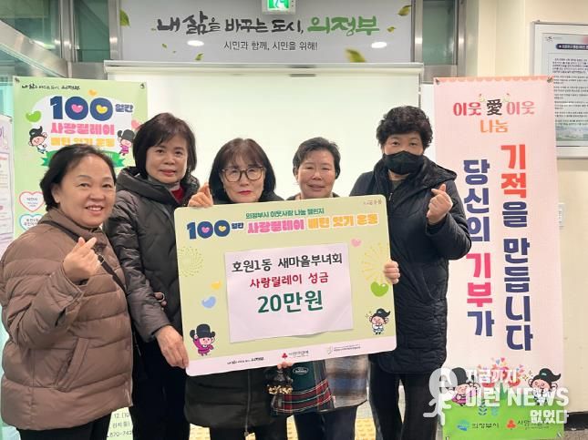 이런뉴스(e-runnews) 김삼성 기자 | 의정부시 호원1동주민센터는 12월 18일 호원1동 새마을부녀회가 관내 어려운 이웃을 위해 ‘100일간 사랑릴레이 배턴 잇기’에 동참해 성금 20만 원을 기탁했다고 밝혔다.