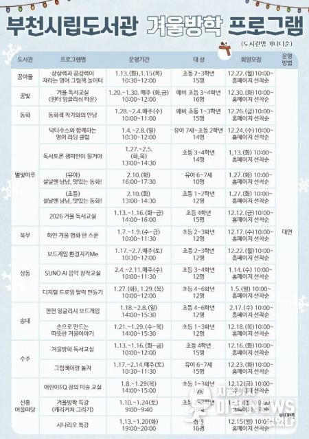 이런뉴스(e-runnews) 김삼성 기자 | 부천시는 겨울방학을 맞아 내년 1월부터 2월까지 부천시립도서관에서 전 연령을 대상으로 독서문화 프로그램과 행사를 운영한다고 30일 밝혔다. 이번 프로그램은 연령과 관심사에 따라 다양한 참여 기회를 제공하기 위해 마련됐다.