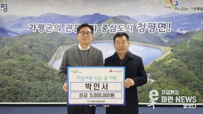 이런뉴스(e-runnews) 김삼성 기자 | 가평군 청평면 박인서 씨는 최근 청평면 행정복지센터를 방문해 어려운 이웃을 위해 사용해 달라며 성금 500만원을 기탁하며 따뜻한 나눔을 전했다.