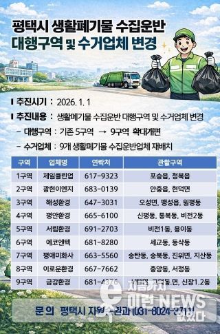이번 개편은 1995년 평택시·송탄시·평택군 통합 이후 유지돼 온 기존체계를 변경하는 것으로, 더 촘촘한 수거망 구축과 신속한 청소 민원 대응을 위해 추진된다.