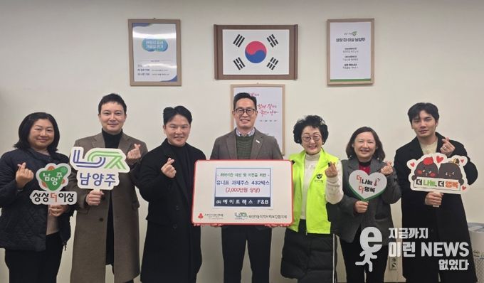 이런뉴스(e-runnews) 김삼성 기자 | 남양주시는 30일 다산행정복지센터에서 ㈜에이트랙스 에프앤비가 지역 아동을 위한 과채주스 432박스를 전달했다고 밝혔다.