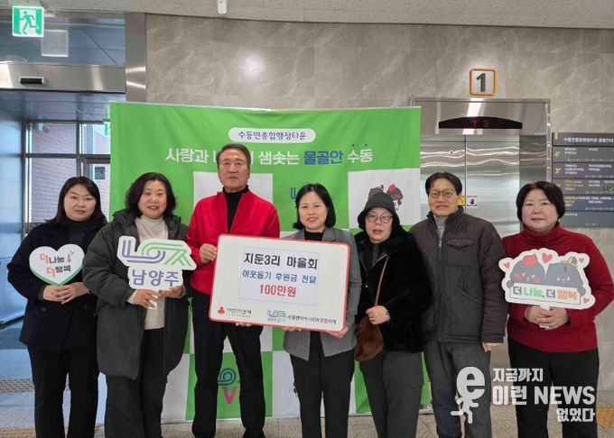 이런뉴스(e-runnews) 김삼성 기자 | 남양주시는 30일 수동면 지둔3리 마을회가 지역 내 어려운 이웃을 위한 후원금 100만 원을 경기사회복지공동모금회를 통해 수동면 지역사회보장협의체에 지정 기탁했다고 밝혔다.