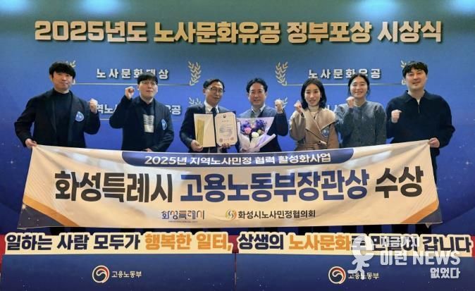 이런뉴스(e-runnews) 김삼성 기자 | 화성특례시는 지난 30일 고용노동부 주관으로 열린 '2025년 노사문화유공 정부포상 시상식’에서 ‘지역노사민정 협력 유공’단체부문 고용노동부장관 표창을 수상했다고 31일 밝혔다.