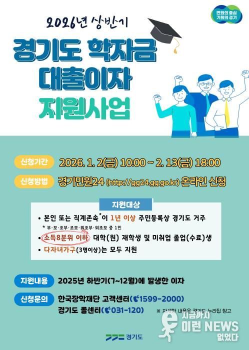 이런뉴스(e-runnews) 김삼성 기자 | 경기도가 오는 2월 13일까지 ‘2026년 상반기 경기도 대학생 학자금 대출이자 지원사업’ 신청자를 접수한다.