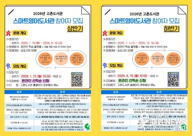 이런뉴스(e-runnews) 김삼성 기자 | 김포시 고촌도서관이 2026년 1월 19일부터 12월 18일까지 ‘2026년 스마트영어도서관’을 운영한다.