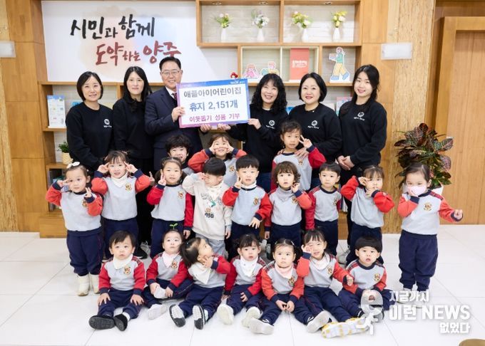 이런뉴스(e-runnews) 김삼성 기자 | 양주시가 5일 애플아이어린이집으로부터 이웃돕기 성품으로 두루마리 휴지 2,151개(100만 원 상당)를 기탁받았다.