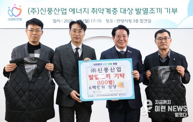 이런뉴스(e-runnews) 김삼성 기자 | 안양시는 5일 오후 5시 15분 시청 3층 접견실에서 관내 기업인 ㈜신풍산업이 지역 저소득층 및 에너지 취약계층의 겨울철 생활 안정을 돕기 위해 발열조끼 100벌(600만원 상당)을 기탁했다고 밝혔다.