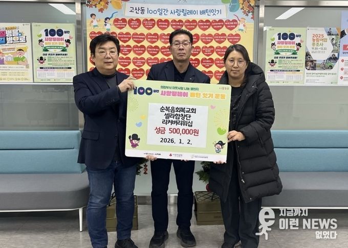 이런뉴스(e-runnews) 김삼성 기자 | 의정부시 고산동주민센터는 1월 2일 산곡동 소재 순복음회복교회, 셀라합창단, 리커버리워십이 ‘100일간 사랑릴레이 배턴 잇기’에 동참해 성금 50만 원을 기탁했다고 밝혔다.