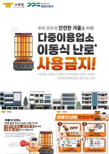 이에 광명소방서는 화재 저감을 위해 이동식 난로 및 온열기구 사용 시 ▲난로 주위 인화성 물질 제거 ▲전도·과열 시 전원이 차단되는 안전장치가 있는 제품 사용 ▲난로 사용 중 주유 금지 등 안전 수칙을 강조했다.