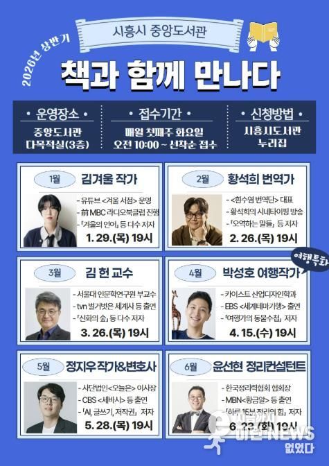 이런뉴스(e-runnews) 김삼성 기자 | 시흥시중앙도서관은 2026년 상반기 시민의 독서문화 향유 기회 확대와 인문적 소양 강화를 위해 운영하는 저자강연 ‘책과 함께 만나다’ 강연 출연진을 공개했다.