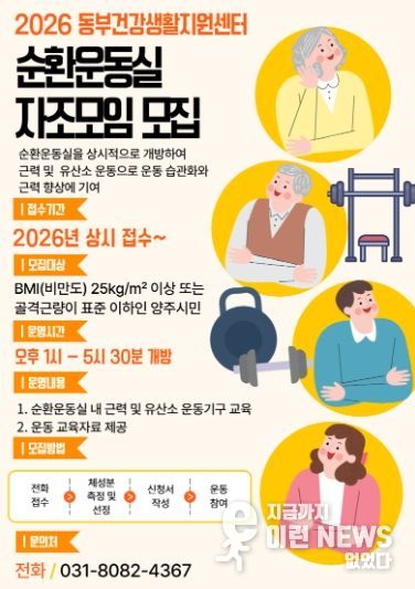 이런뉴스(e-runnews) 김삼성 기자 | 양주시 보건소 동부건강생활지원센터가 지역주민의 신체활동 참여를 활성화하고 건강한 생활 습관 형성을 위해 ‘2026년도 순환운동실 자조모임’ 참가자를 연중 수시로 모집한다.