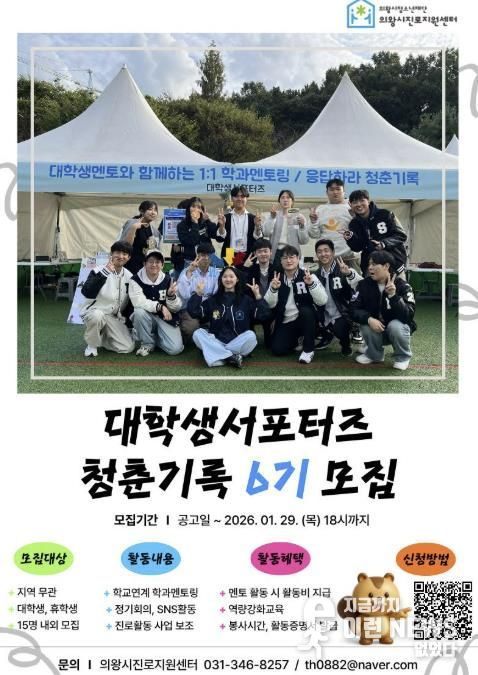 이런뉴스(e-runnews) 김삼성 기자 | 의왕시청소년재단 산하 의왕시진로지원센터 ‘꿈터’가 청소년 진로 활동에 관심 있는 대학생을 대상으로 2026년 대학생서포터즈 '청춘기록' 6기를 오는 1월 29일까지 모집한다.