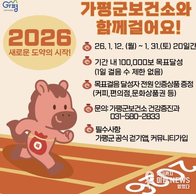 이런뉴스(e-runnews) 김삼성 기자 | 가평군보건소가 ‘2026년 보건소와 함께 걸어요!’를 주제로 건강 걷기 프로그램을 운영하며 새해 걷기운동 실천을 독려한다.