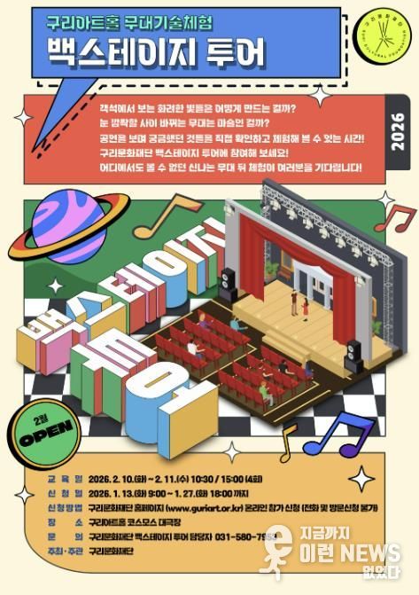 이런뉴스(e-runnews) 김삼성 기자 | 구리문화재단은 〈무대 기술 체험 백스테이지 투어 프로그램〉 참가자를 오는 1월 13일 오전 9시부터 1월 27일 오후 6시까지 재단 홈페이지를 통해 선착순 모집한다고 밝혔다.
