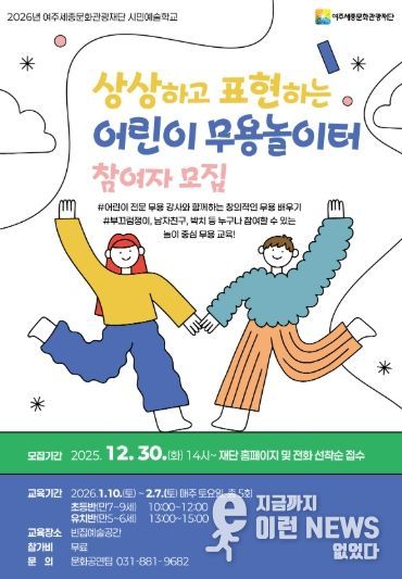 이런뉴스(e-runnews) 김삼성 기자 | 여주세종문화관광재단은 오는 1월 10일부터 시민예술학교 '상상하고 표현하는 어린이 무용 놀이터'를 진행한다.