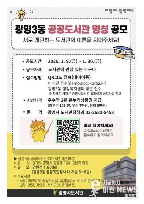 이런뉴스(e-runnews) 김삼성 기자 | 광명시가 광명3동 새 도서관의 이름을 지어줄 주인공을 찾는다.