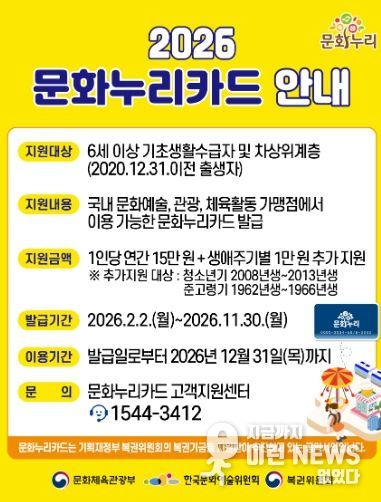 통합문화이용권(문화누리카드)은 6세 이상 기초생활수급자와 차상위계층을 대상으로 문화·여행·체육 활동을 지원하는 사업으로, 2026년에는 지원 인원이 16,386명으로 전년 대비 1,687명 증가한다. 또한 1인당 지원 금액도 기존 14만 원에서 15만 원으로 1만 원 인상된다.