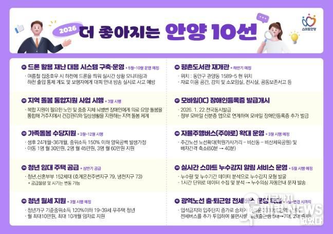 안양시(시장 최대호)는 ▲드론 활용 재난 대응시스템 구축·운영 ▲지역 돌봄 통합지원사업 시행 ▲가족돌봄수당 지원 ▲청년임대주택 공급 ▲안양시 청년월세 지원(사업대상 확대) ▲평촌도서관 재개관 등 ‘2026년 더 좋아지는 안양 10선’을 12일 소개했다.