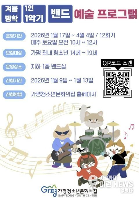 이런뉴스(e-runnews) 김삼성 기자 | 가평청소년문화의집은 1월 9일부터 13일까지 ‘1인 1악기 밴드 프로그램’에 참여할 청소년을 모집한다고 12일 밝혔다.