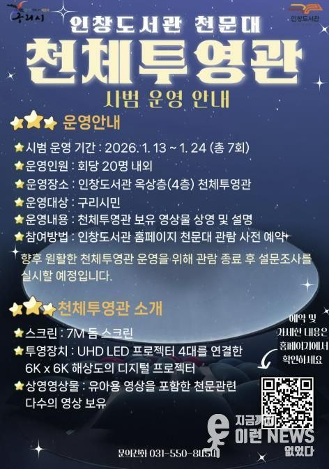 이런뉴스(e-runnews) 김삼성 기자 | 구리시는 오는 1월 13일부터 24일까지 인창도서관 옥상에 설치된 천체투영관의 시범운영을 실시한다고 밝혔다.