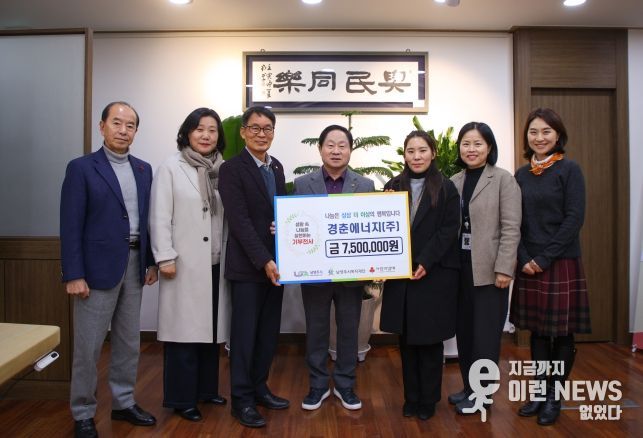 이런뉴스(e-runnews) 김삼성 기자 | 남양주시는 13일 (주)경춘에너지(대표 전인권)가 지역 내 취약계층 지원을 위해 후원금 750만 원을 동부희망케어센터(센터장 신영미)와 수동면 지역사회보장협의체(위원장 박경숙)에 전달했다.