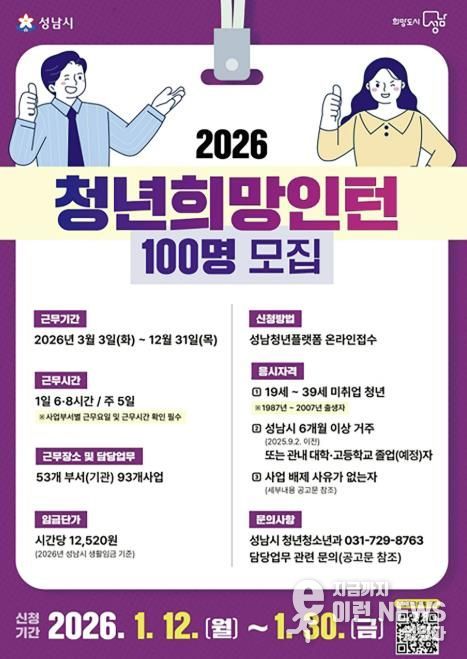 이런뉴스(e-runnews) 김삼성 기자 | 성남시는 오는 1월 30일까지 ‘청년 희망 인턴 사업’ 참여자 100명을 모집한다.