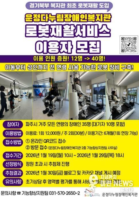 이에 따라 파주시는 2025년 12월 지면 보행형 로봇 재활 훈련 장치 1대를 추가 설치해 아동부터 성인까지 전 연령층이 이용할 수 있는 로봇 재활 기반 시설을 구축했다. 또한 올해 1월 중에는 치료사 2명을 추가로 채용해 로봇 재활치료 이용 정원을 대폭 확대할 예정이다.