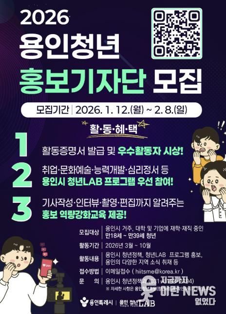 이런뉴스(e-runnews) 김삼성 기자 | 용인특례시는 2월 8일까지 청년의 시각으로 시정과 지역 소식을 전하는 ‘용인청년 홍보기자단’을 모집한다고 14일 밝혔다.