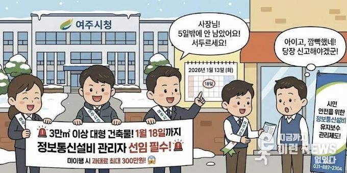 현재 여주시 내 연면적 3만㎡ 이상인 대형 건축물의 관리주체는 오는 2026년 1월 18일까지 정보통신설비 유지보수 관리자를 선임하고 지자체에 신고를 완료해야 합니다.