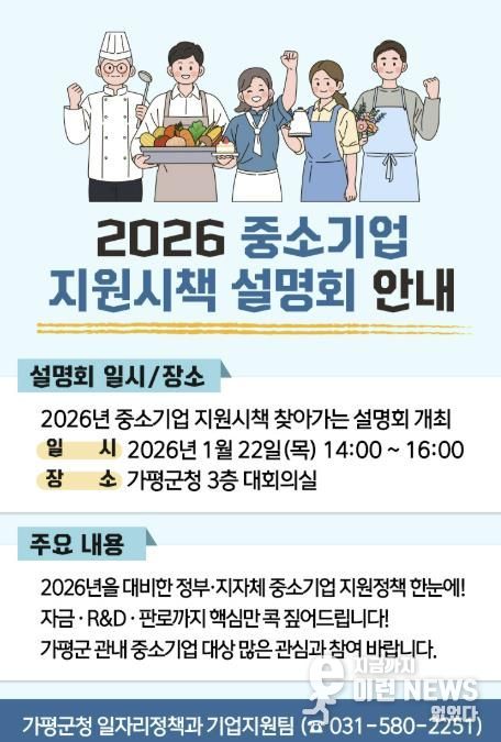 가평군은 관내 중소기업을 대상으로 ‘2026년 중소기업 지원시책 설명회’를 오는 22일 오후 2시 가평군청 3층 대회의실에서 개최한다고 밝혔다. 이번 설명회는 2026년도 중소기업 지원정책을 종합적으로 소개하는 한편 기업 현장의 애로사항을 직접 청취해 정책 수요에 반영하기 위해 마련됐다. 설명회에는 중소벤처기업진흥공단, 기술보증기금, 소상공인진흥공단, 경기중소벤처기업청 등 10개 기관이 참여한다.