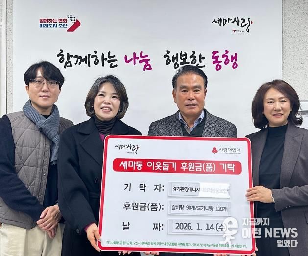 이런뉴스(e-runnews) 김삼성 기자 | 오산시 세마동 행정복지센터는 지난 14일 경기환경에너지사회적협동조합으로부터 관내 위기이웃 지원을 위한 갈비탕 90개와 도가니탕 120개 등 약 100만 원 상당의 후원 물품을 기탁받았다고 밝혔다.