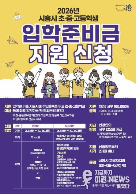 이런뉴스(e-runnews) 김삼성 기자 | 시흥시는 올해부터 관내 초중고 입학 자녀 가정에 입학준비금을 10만 원씩 지원한다. 이번 지원은 도서나 문구류 등을 새로 마련해야 하는 신입생 가정의 경제적 부담을 줄여주고, 교육 기본권을 강화하고자 추진됐다.