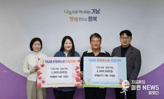 이런뉴스(e-runnews) 김삼성 기자 | 여주시 가남읍 행정복지센터은 지난 15일, 관내 사업체인 동명농기구와 카페 발리에서 지역 내 취약계층을 위한 이웃돕기 성금을 기탁했다고 밝혔다.
