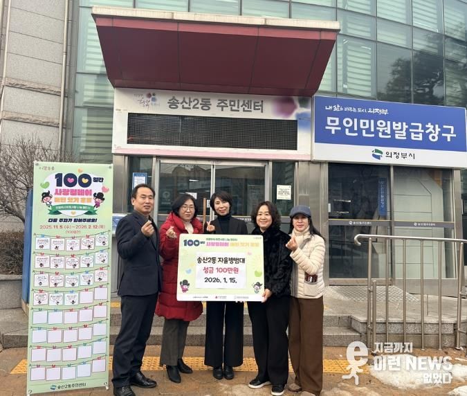 이런뉴스(e-runnews) 김삼성 기자 | 의정부시 송산2동주민센터는 1월 15일 송산2동 자율방범대가 ‘100일간 사랑릴레이 배턴 잇기’의 일환으로 성금 100만 원을 기탁했다고 밝혔다.