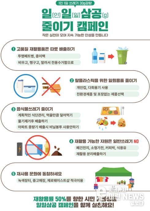 이런뉴스(e-runnews) 김삼성 기자 | 안성시는 시민의 자발적인 실천을 통해 재활용률을 높이고 생활쓰레기 발생량을 줄이기 위한 ‘1인 1일 쓰레기 30그램 줄이기(일일삼공) 캠페인’을 적극 추진하고 있다고 밝혔다.