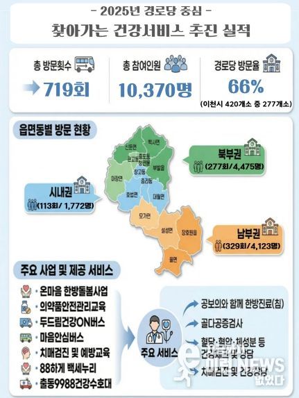 분석 결과, 2025년 한 해 동안 경로당 277개소를 총 719회 순회하여 10,370명의 어르신에게 한방진료, 골밀도 측정, 건강상담, 치매검진, 운동교실 등 다양한 건강관리서비스를 제공했다. 이는 이천시 전체 경로당의 66%(277개소)에 달하는 수치다.