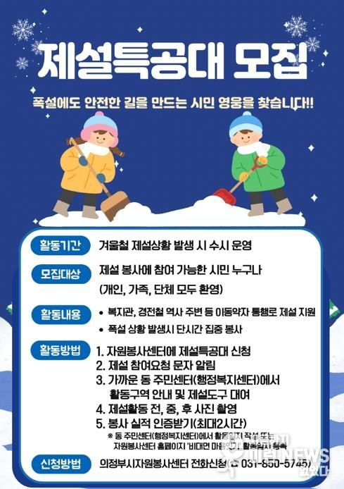 이런뉴스(e-runnews) 김삼성 기자 | 의정부시는 겨울철 폭설로 인한 시민 불편을 최소화하고 안전한 보행환경을 조성하기 위해 ‘제설특공대’를 모집한다.