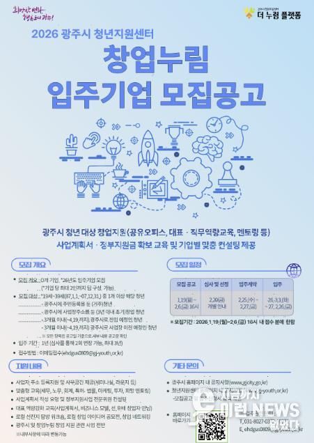 이런뉴스(e-runnews) 김삼성 기자 | 광주시는 지역 내 유망한 청년 창업가를 발굴하고 안정적인 창업 환경을 조성하기 위해 ‘2026년도 창업누림 신규 입주기업’을 공개 모집한다고 19일 밝혔다.