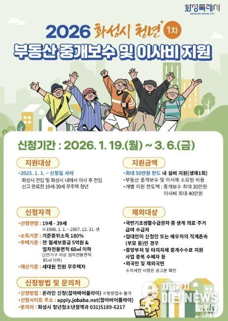 이런뉴스(e-runnews) 김삼성 기자 | 화성특례시가 19일부터 3월 6일까지 청년들의 주거비 부담 경감 및 정주 여건 향상을 위한 ‘2026년 상반기 청년 부동산 중개보수 및 이사비 지원사업’ 신청을 받는다.