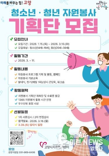 고양시자원봉사센터 관계자는 “청소년과 청년이 자원봉사를 통해 스스로 성장하고, 그 경험이 지역사회에 긍정적인 영향으로 이어질 수 있도록 적극 지원하겠다”며 “청소년, 청년들이 2026년 기획단 모집에 많은 관심을 갖고 참여하길 바란다”고 전했다.