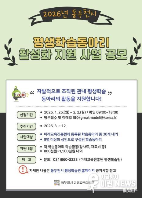 이런뉴스(e-runnews) 김삼성 기자 | 동두천시는 오는 1월 26일부터 2월 2일까지, 시민 주도형 평생학습 문화 확산을 위해 ‘2026년 평생학습 동아리 활성화 지원사업’에 참여할 학습동아리를 모집한다고 밝혔다.