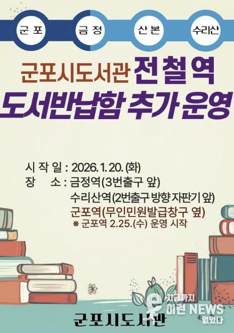 이런뉴스(e-runnews) 김삼성 기자 | 군포시는 시민들의 일상 속 독서 접근성을 높이기 위해 2026년 1월 20일부터 관내 전철역(도시철도역) 통합도서반납함 운영을 확대한다고 밝혔다.