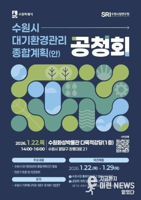 이런뉴스(e-runnews) 김삼성 기자 | 수원특례시는 22일 오후 2시부터 4시까지 수원화성박물관 다목적강당에서 ‘수원시 대기환경관리 종합계획(안) 공청회’를 열고 시민 의견을 수렴한다.