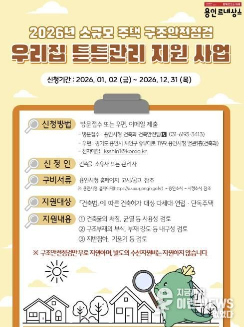 이런뉴스(e-runnews) 김삼성 기자 | 용인특례시는 지역내 다세대와 연립, 단독주택 등 소규모 주택의 정밀 구조 안전점검을 무상으로 지원한다고 21일 밝혔다.