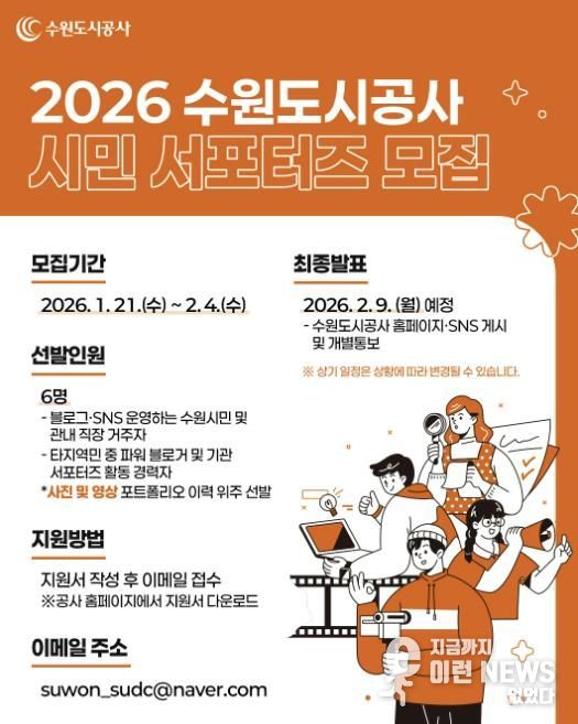 이런뉴스(e-runnews) 김삼성 기자 | 수원도시공사가 21일부터 다음 달 4일까지 2026년도 제8기 시민 서포터즈를 모집한다.
