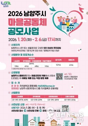 이런뉴스(e-runnews) 김삼성 기자 | 남양주시는 1월 20일부터 2월 6일까지 ‘2026년 마을공동체 공모사업’참여 공동체를 공개 모집한다.