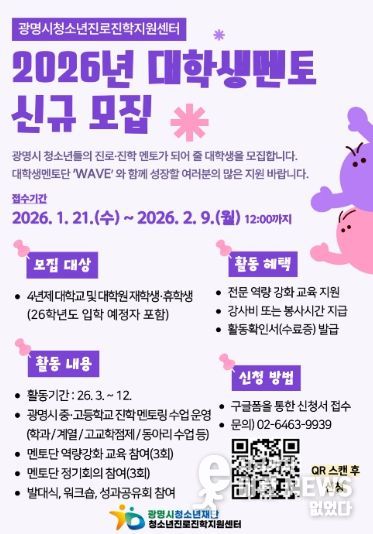 이런뉴스(e-runnews) 김삼성 기자 | 광명시청소년재단 청소년진로진학지원센터는 관내 중·고등학교 청소년 대상 학과 멘토링 운영을 위해 ‘2026년 대학생 멘토단(wave)’을 모집한다고 밝혔다.